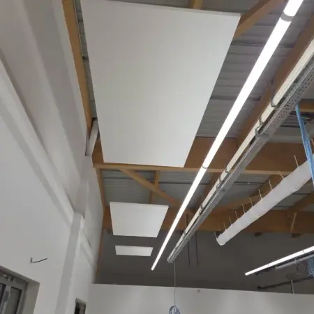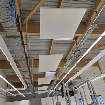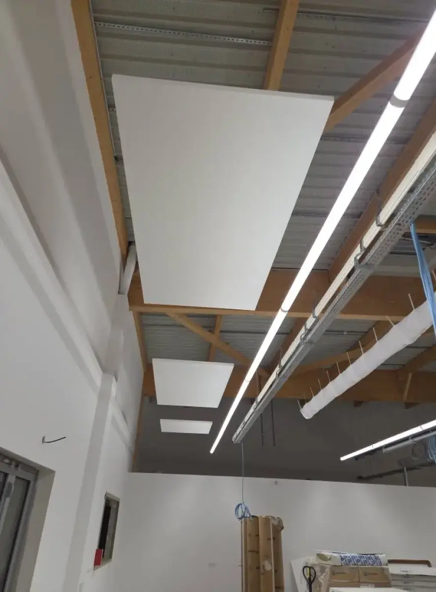 Ces panneaux sont installés en plafond afin de réduire la réverbération sonore et améliorer la qualité acoustique globale du bâtiment.